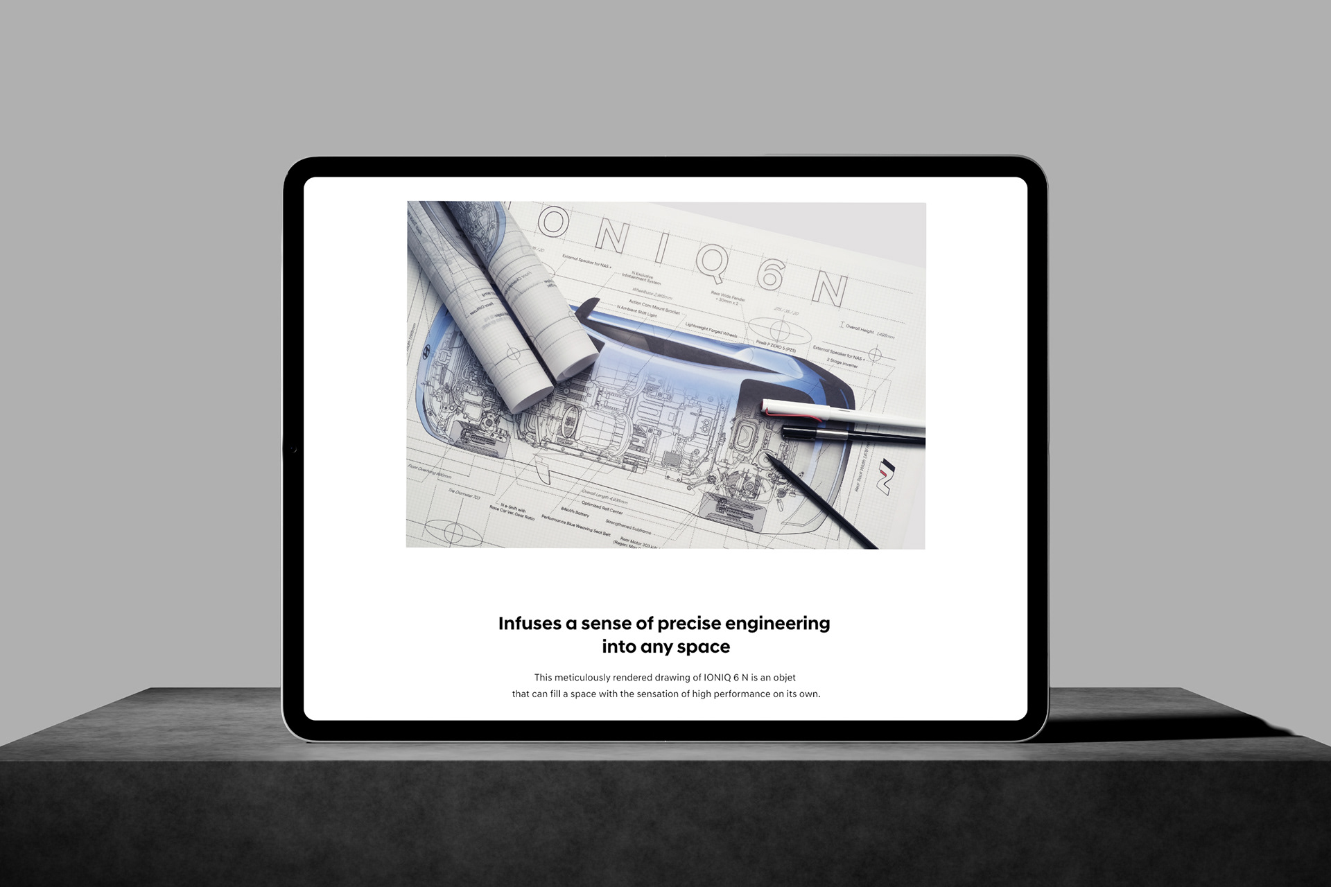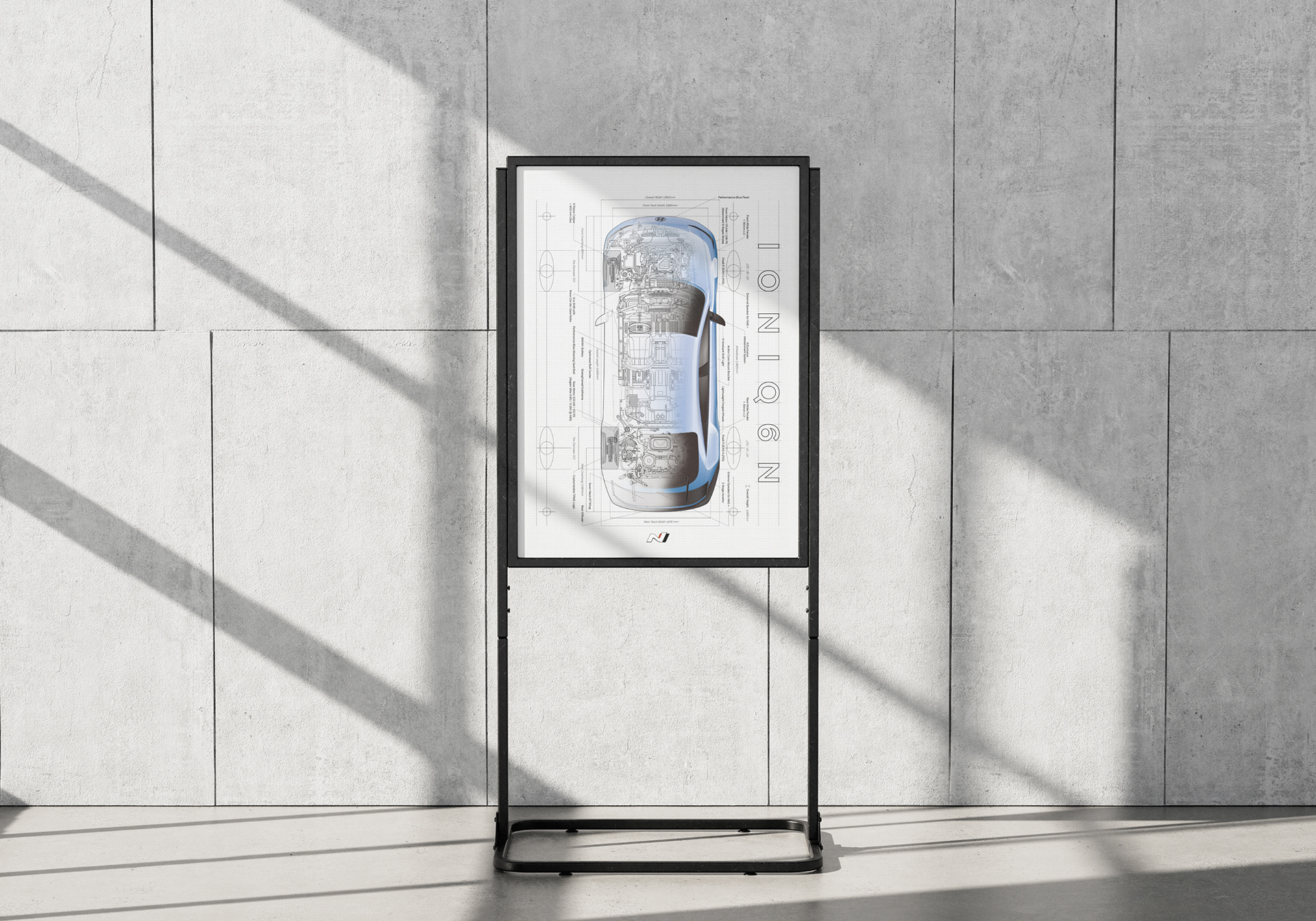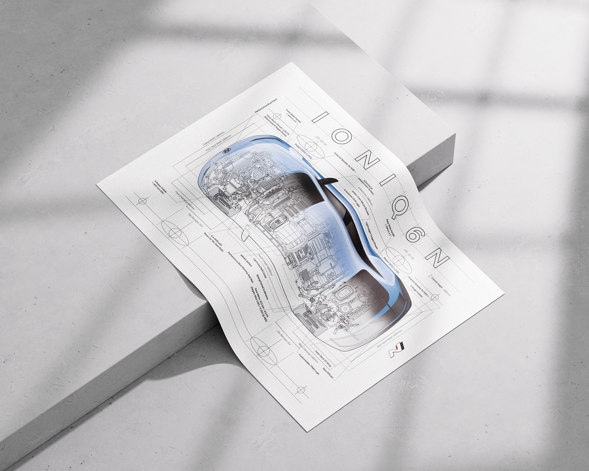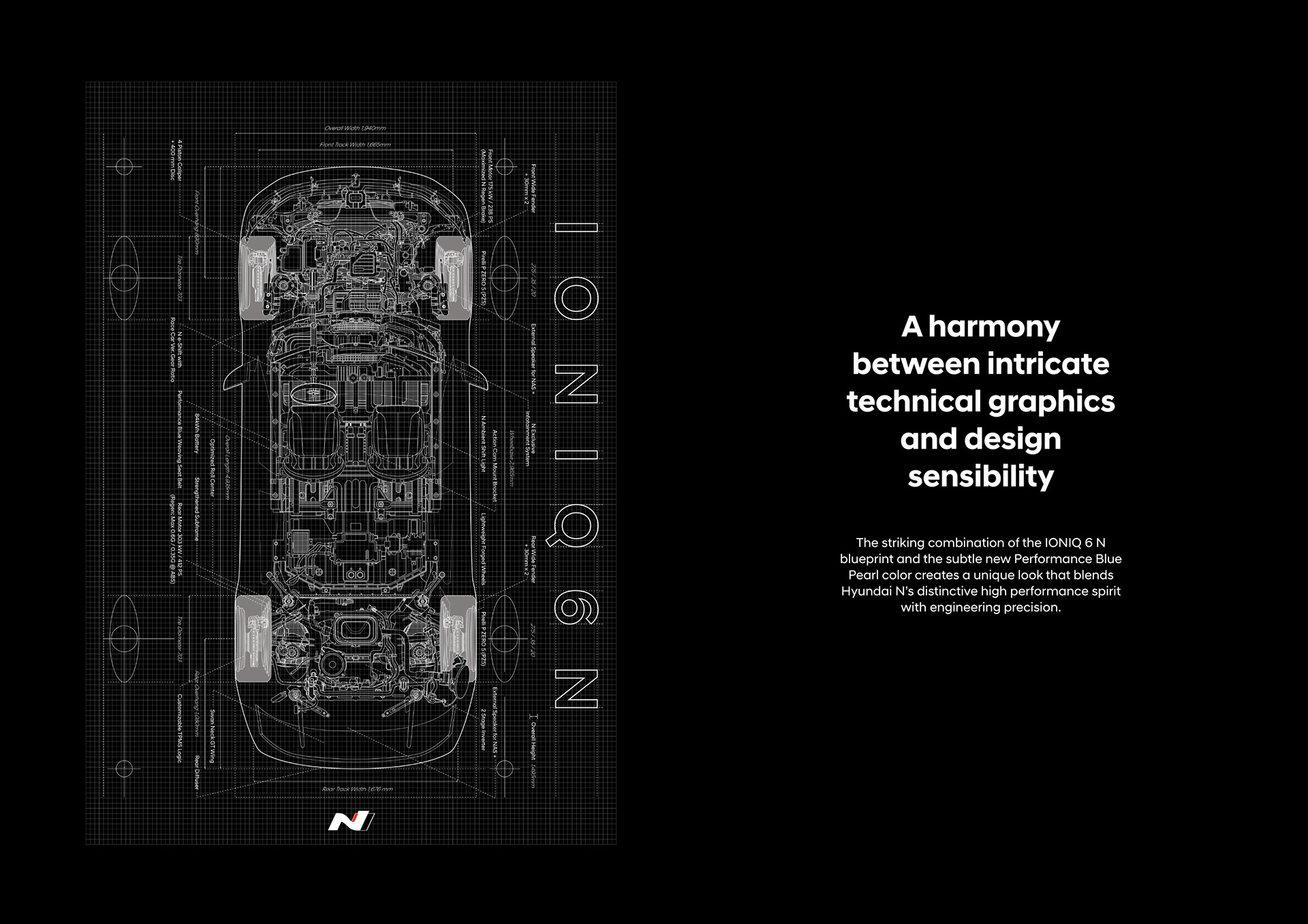A key visual that precisely translates the engineering structure and performance character of IONIQ 6 N into a vehicle-illustration language. Technical layers and visual density are fused into a system scalable across applications.