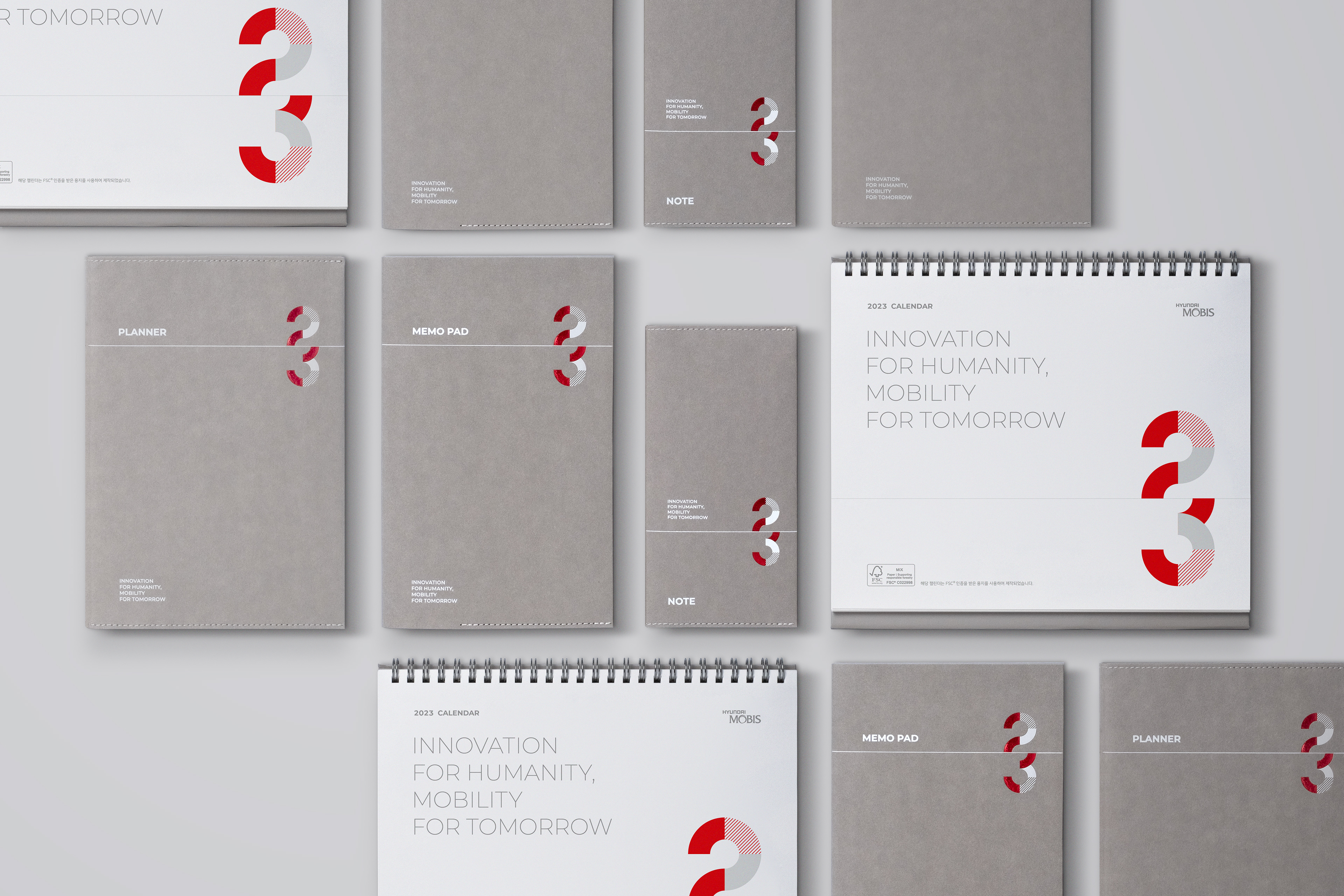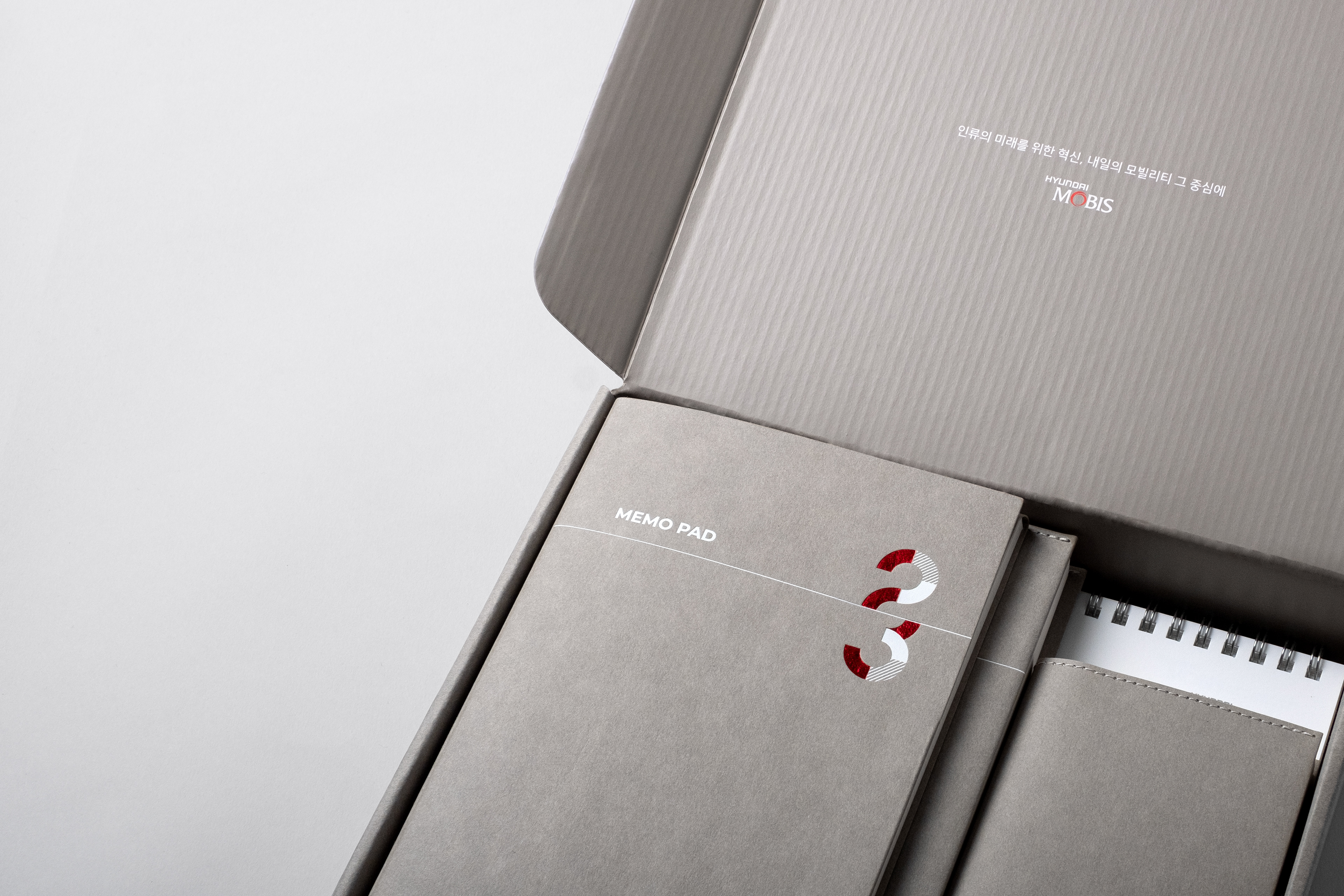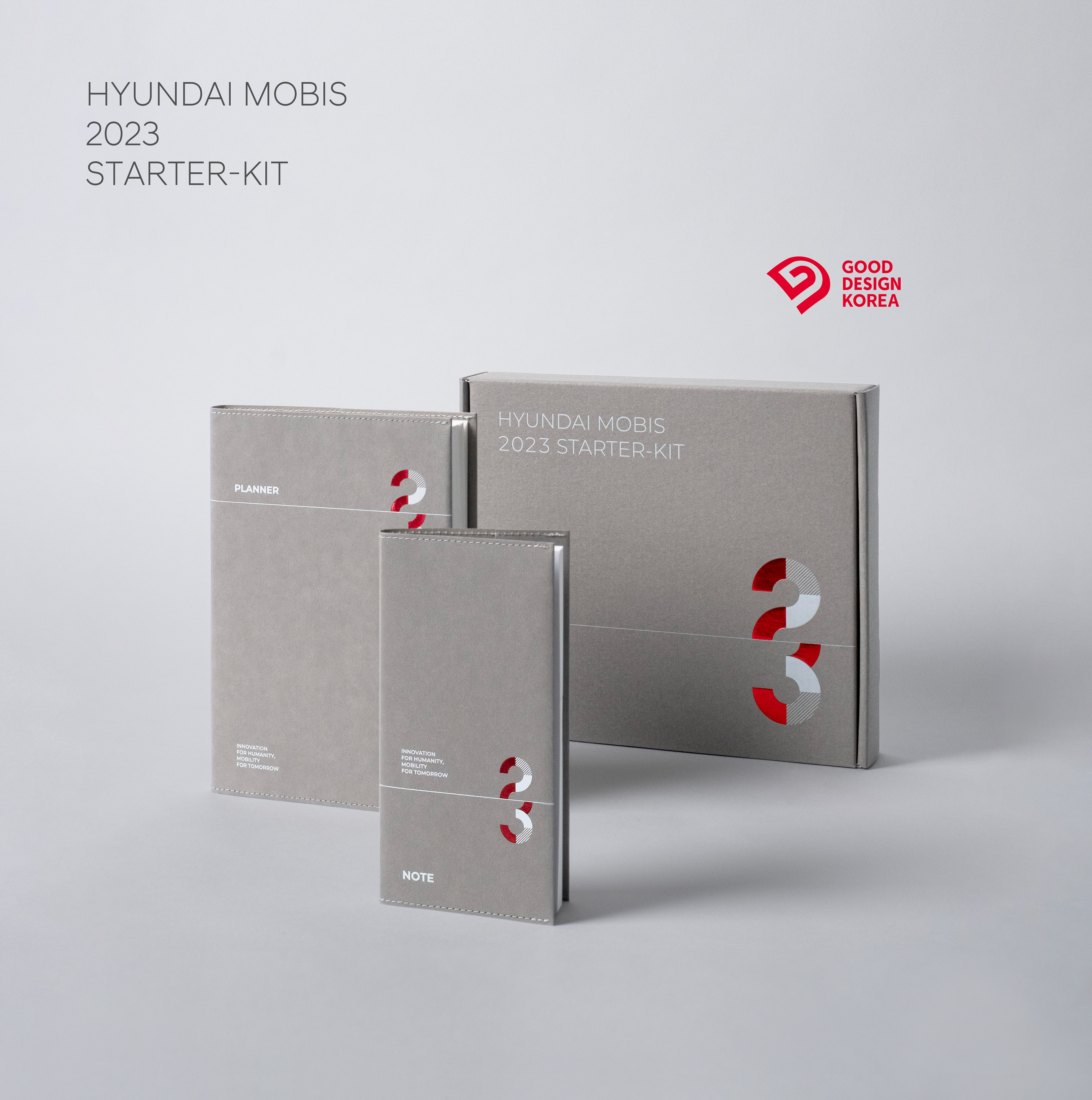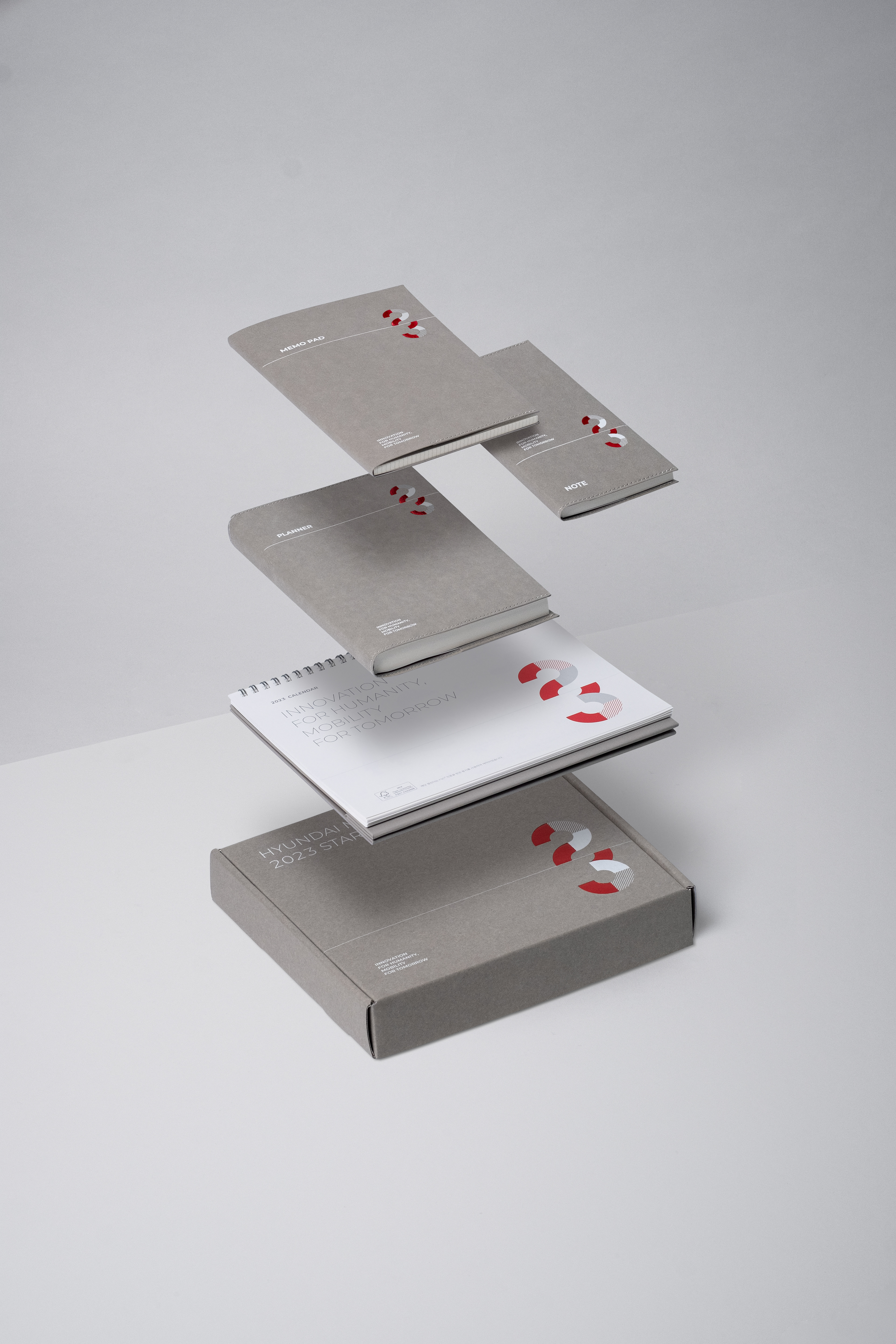 The Hyundai Mobis 2023 Starter-Kit features a special collection of goods reflecting our core values of growth, collaboration, vision, and creativity. Including desktop calendars, diaries, notebooks, and memo pads, these elegantly designed items are ideal for professional use.