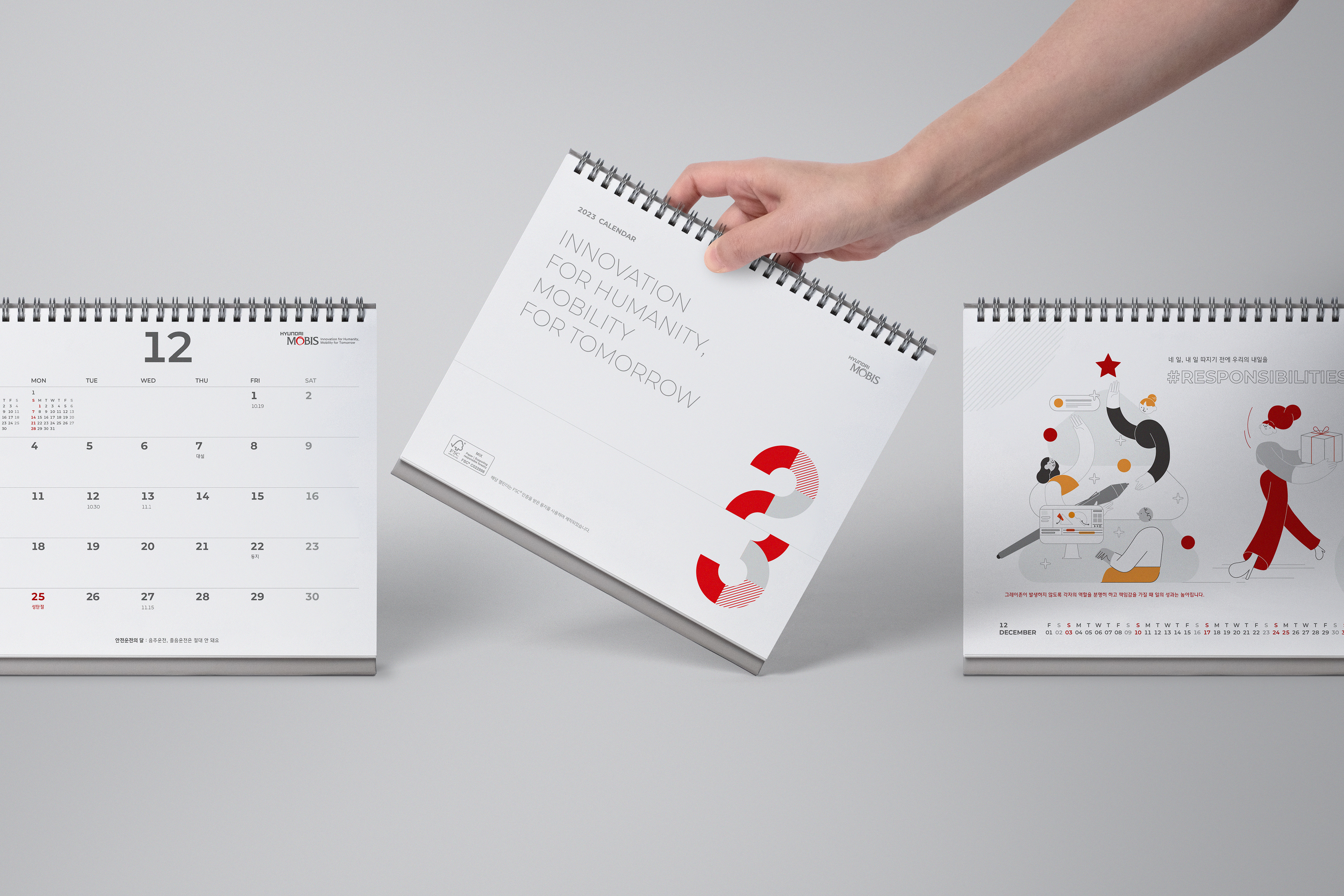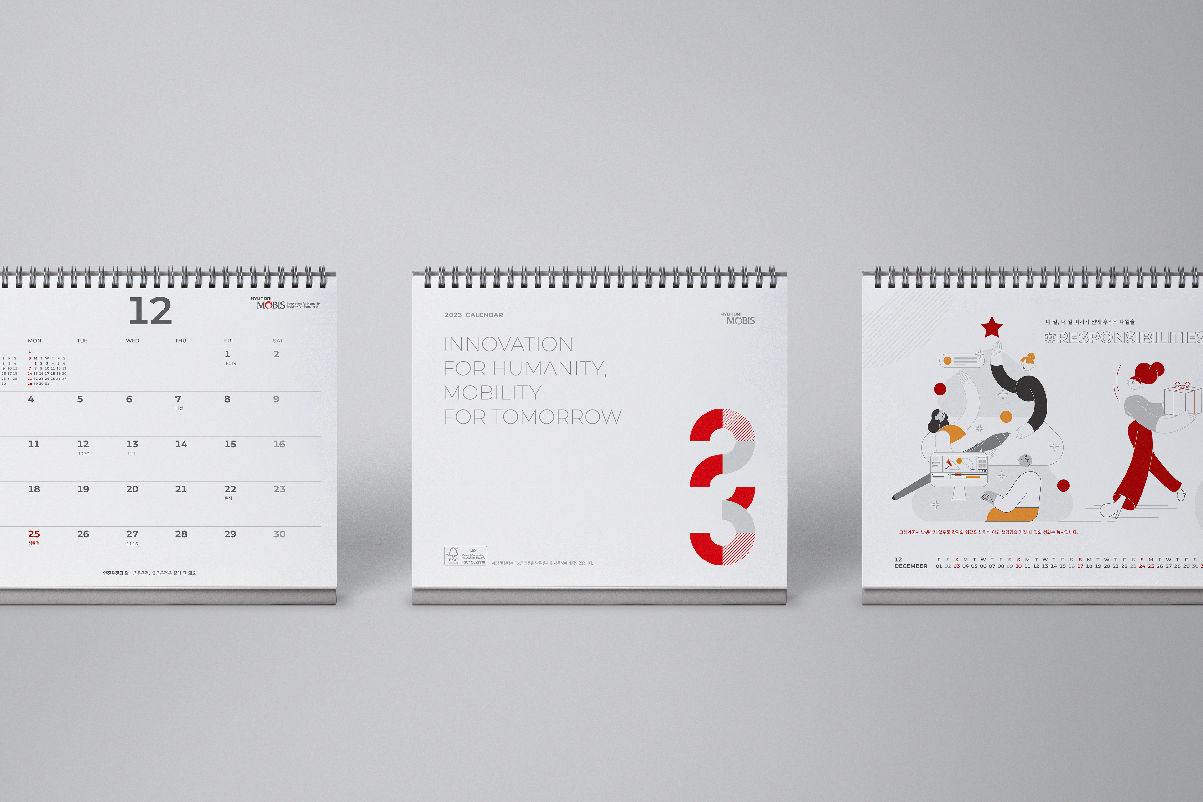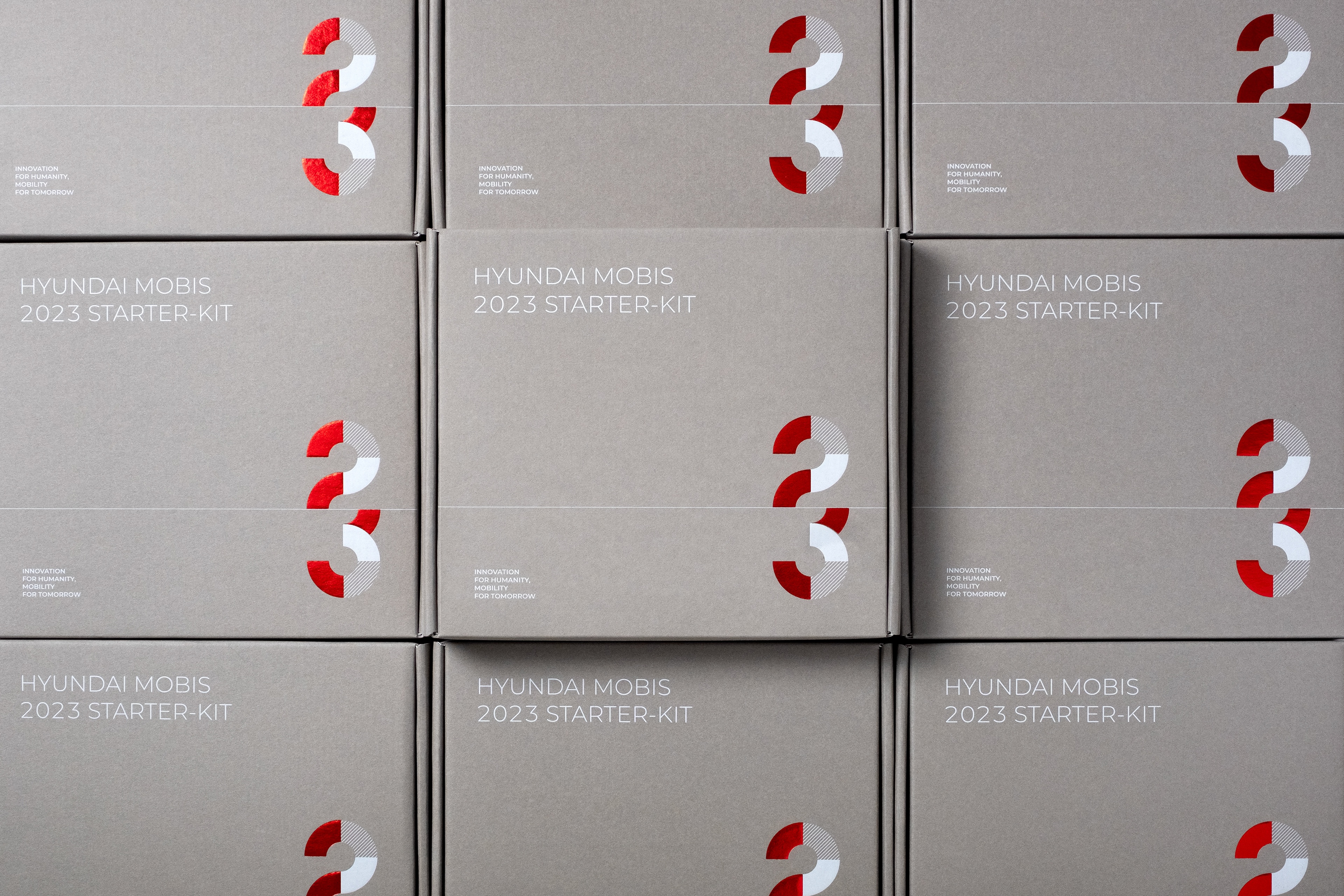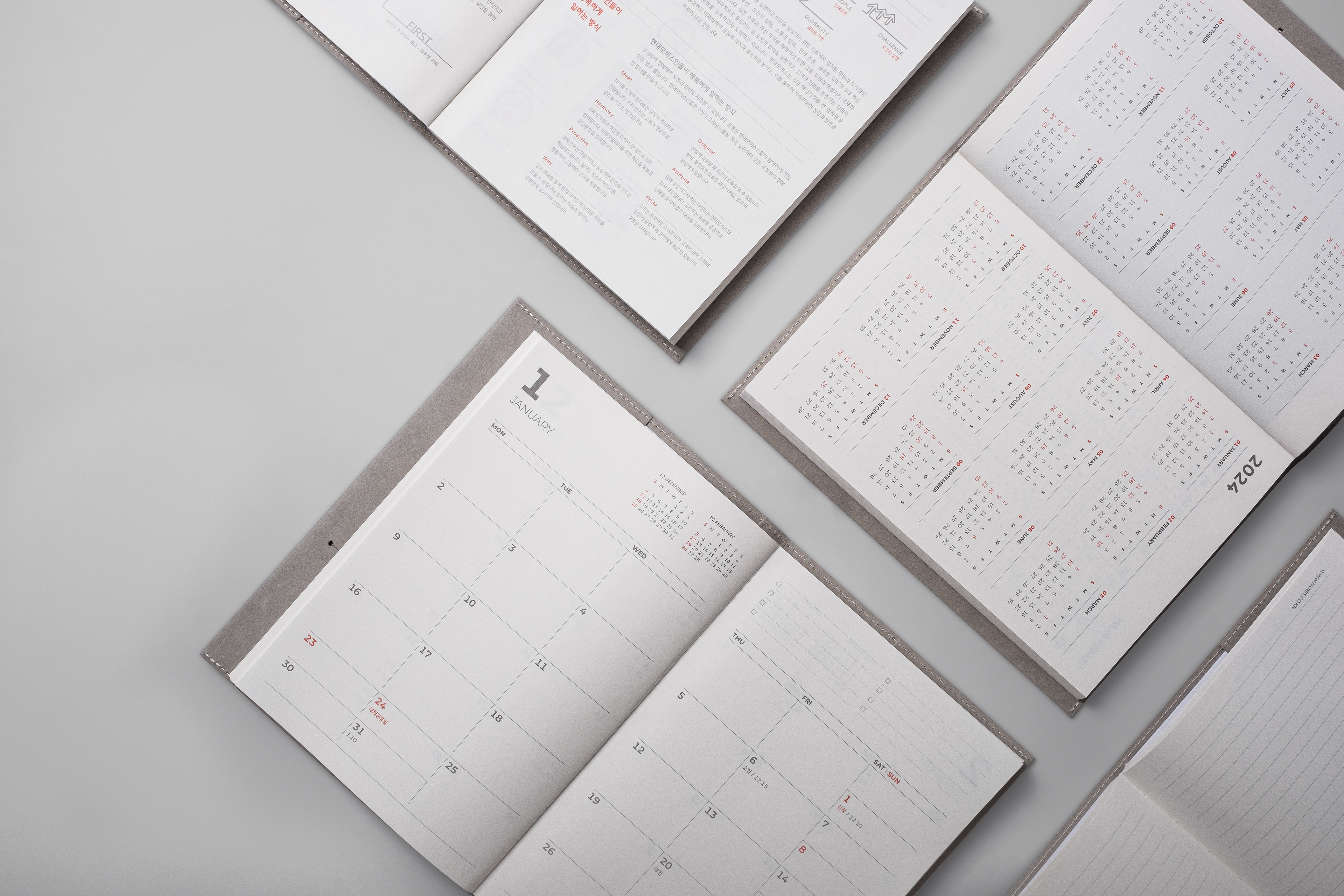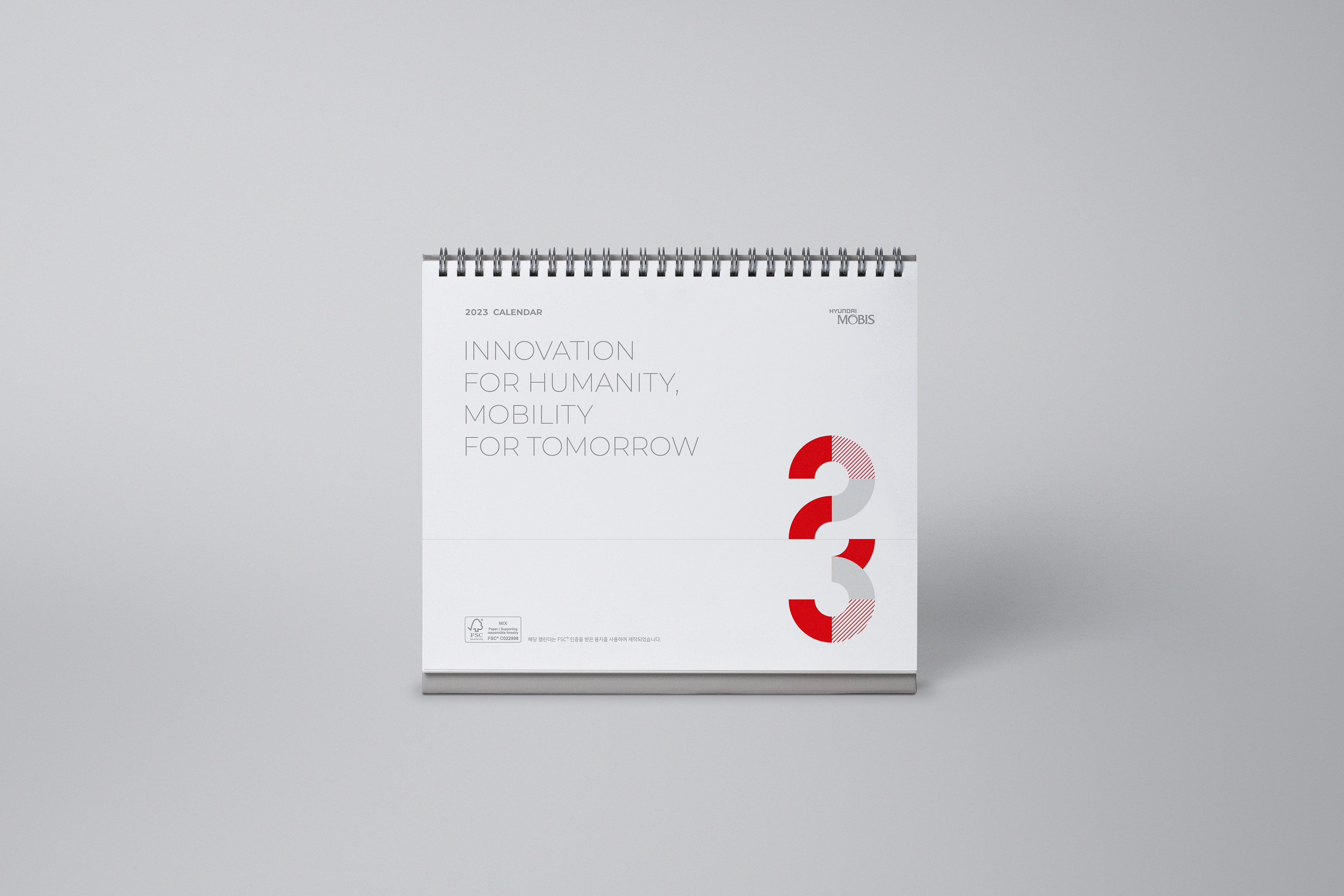 The Hyundai Mobis 2023 Starter-Kit features a special collection of goods reflecting our core values of growth, collaboration, vision, and creativity. Including desktop calendars, diaries, notebooks, and memo pads, these elegantly designed items are ideal for professional use.